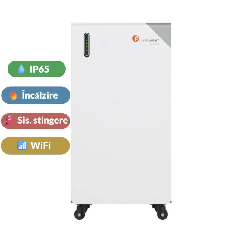 7,799.00 lei (TVA 21% inclus)Baterie Felicity Solar 16kWh FLB48314TG1-H LiFePO4 51.2V IP65 cu WiFi si sistem stingere incendii + incalzire + Cabluri + Roti